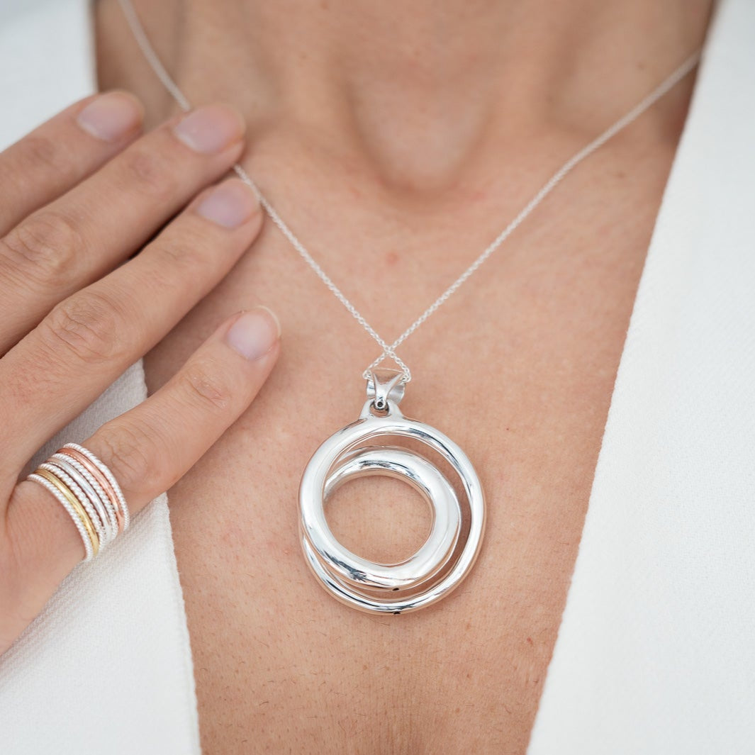 De Elin hanger bestaat uit twee in elkaar gevlochten zilveren ringen – een tijdloos symbool van eenheid en harmonie, elegant en subtiel vormgegeven.