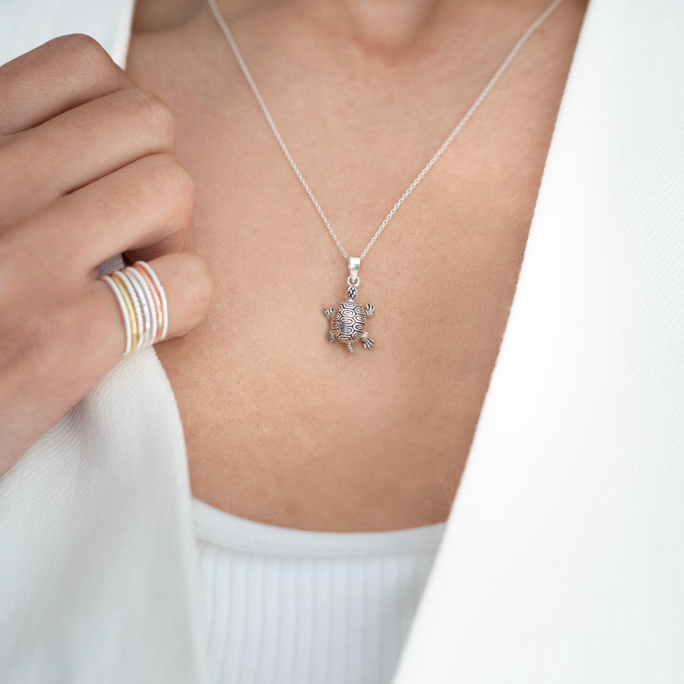 Een fijn bewerkte schildpadhanger van puur zilver. Het combineert ingetogen elegantie met de symbolische charme van de schildpad, die staat voor een lang leven en wijsheid. Een tijdloos accessoire voor elke gelegenheid, dat elke outfit subtiel laat stralen.